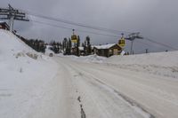 A snow-covered landscape in British Columbia, Canada. A gloomy winter day with grey skies. Houses dot the roads leading to recreational destinations. Overhead power lines provide electricity for ski slopes. Gondola brings visitors to Okanagan for winter activities.