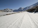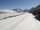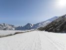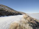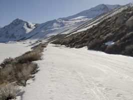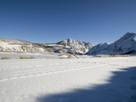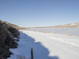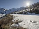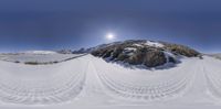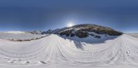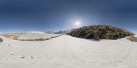 A panoramic view from inside a mirror, showcasing a snow-covered landscape with trees in the foreground. The clear sky and sunshine highlight the freezing temperatures. A serene winter day in the mountains.