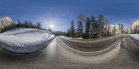 Aerial view of a snow-covered mountain pass in the Swiss Alps. The road winds through the highland landscape, surrounded by tall trees. Clear skies and sunshine illuminate the curved road, creating a picturesque winter scene.