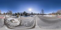 Upside down image of a snow-covered parking lot in a suburban area of Toronto, Ontario. The road at the bottom of a small hill leads to a straight path. Clear sky casts hard shadows on the residential and recreational areas.