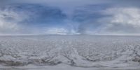 a cloud is coming off an overcast sky with a view across the field to a large, distant snow covered plain