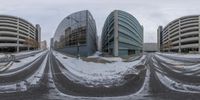 Snow-covered road in Detroit, lined with a building featuring numerous windows. The urban winter scene displays a straight road leading to a parking lot. The brick wall adds character to the art district neighborhood.