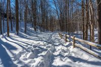 This is a photo taken in Ontario, Canada on a snowy winter day. The image shows a straight road covered in snow, leading through a wooded area. The clear sky above adds to the serene and peaceful atmosphere of the rural setting. This scene represents the beauty and tranquility of winter in Canada. The snow-covered trail creates a picturesque view, and the location of the photo is near Toronto, Ontario.