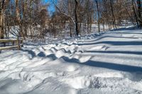 This stock photo features a snowy road in the rural area of Ontario, Canada. The path is partly covered with snow while a clear sky can be seen above. The image captures the peaceful and serene atmosphere of a winter day in the woods.