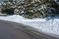 the street is filled with snow by some evergreen trees and shrubs on a sunny day