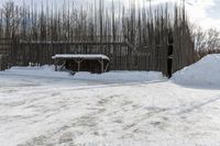 This photo shows a rural road covered in snow, with a small shed on the side. The road is located in a forested area near Montreal, Canada. The image was taken during the day, with clouds in the sky. The open space of the road surface is completely covered in snow.