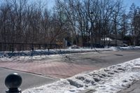 a street with a fence, cars and snow on it near a city sidewalk lined with trees