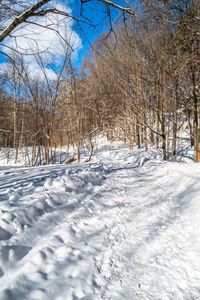 A snowboarder is skillfully skiing up the hill and down the slope in the picturesque woods of rural Ontario, Canada. The snow-covered ground showcases the beautiful winter scenery, as fluffy clouds disperse across the bright sky. The adventurous journey takes place during the day, as the snowboarder maneuvers along an inviting road covered in fresh snow.