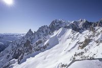 A stunning view of the snow-covered Alps in Italy and France. The clear sky allows for a sunny day, with sunshine reflecting off the glacial surface. This popular tourist attraction offers an overview of the majestic mountain range.
