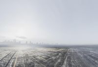 This stock photo features an airport with snow on the ground and a city in the background. The image was taken on an overcast day, creating a dramatic atmosphere. The snow-covered asphalt parking lot contrasts with the white fog and grey sky. Despite the freezing weather, the sun is visible on the horizon, adding a touch of sunshine to the scene. The urban cityscape and mountain in the overview provide a stunning view of the snowy landscape.