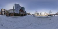 A fish-eye lens captures the snowy cityscape, with buildings and skyscrapers standing tall. The grey sky adds to the urban design, while the snow-covered ground creates a peaceful atmosphere. A beautiful winter day in the city.
