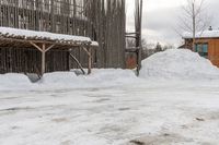 This stock photo features a rural shopfront in Montreal, Canada on a snowy day. The snow drifts along the sidewalk in front of the building, which has a shed and awning. The snow-covered surface adds to the charming winter scene. Perfect for representing rural shopping or the winter ambiance in Montreal.