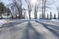 A rural road in Ontario, Canada covered in snow and surrounded by forest. The tree branches are weighed down by frost and ice, casting hard shadows in the winter sun. The clear sky adds to the picturesque winter landscape.