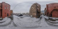 a view of the snow from an intersection in a small city town setting with a red brick building on one side and a red brick building at the other