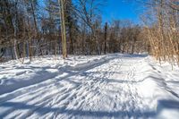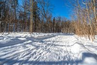 a snow covered trail in the woods in winter season in the middle of an open meadow