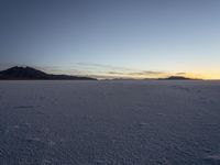 an empty snowy landscape with footprints on it at sunset with mountains in the distance as well
