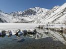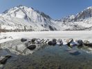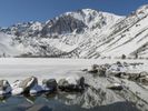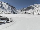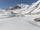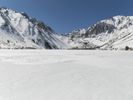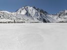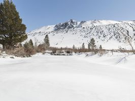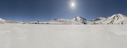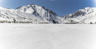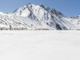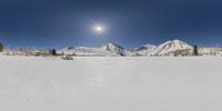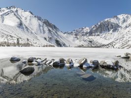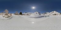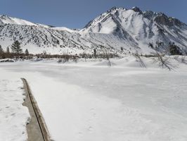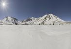 A breathtaking winter landscape with a snow-covered mountain range in the distance. The clear blue sky and sunshine create a picturesque scene. A serene ice lake reflects the stunning surroundings.