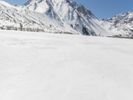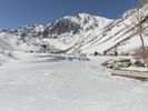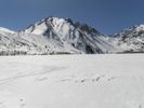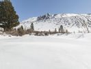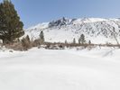 this image shows a snowy area with a clear blue sky and mountain in the distance