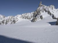 This image captures the breathtaking winter landscape of the Alps, straddling Italy and France in Europe. In the foreground, a skier glides gracefully across the snow-covered surface, while in the background, majestic mountain ranges and towering cliffs create a stunning view. The clear sky overhead allows the sunlight to cast hard shadows on the pristine snow. This scenic overlook is a popular tourist attraction, showcasing the glacial beauty of the area. With its vast open spaces and picturesque mountain landforms, it's no wonder the Alps are a sought-after destination for nature lovers and outdoor enthusiasts.