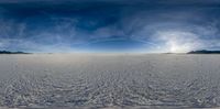 Snow-covered plains in Utah, with a plane flying overhead. The clear sky at dawn creates a dark and serene landscape. Two figures stand in the distance, enjoying the peacefulness of the open space.