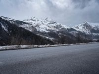 This image captures a gloomy winter day in the Alps, France. The landscape shows a wet road winding through a rural valley, surrounded by mountains. The grey sky and foul weather add to the overall gloominess of the scene. This photo represents the natural beauty of the European countryside during the winter season.