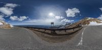 the 360 - view lens picture shows the road and mountains in the distance with clouds