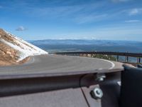 a man is riding his bike down a mountain road with snow and rocks in the background