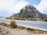 This image showcases a scenic mountain road in Spain, specifically on the Balearic Islands. The road is made of asphalt and runs along the coast, offering stunning views of the water and the mountainous landscape. The hill behind the two people on bicycles is covered in rocky cliffs. The clear sky and the presence of clouds overhead add to the natural beauty of the scene. This photo captures the essence of nature and adventure in Spain's highlands. It depicts a winter day, with snow covering parts of the mountain and grass on the roadside.