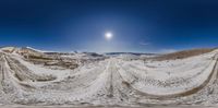 a snowy road surrounded by hills under a bright sun light and sky with snow on it