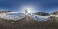 two roads covered in snow on the ground in front of a mountain range with trees