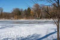 A suburban park in Ontario, Canada, blanketed in snow. Toronto's open spaces offer recreational opportunities in a residential setting. A snowy day brings a serene atmosphere to the surface of the water, surrounded by trees.