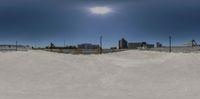 a large skateboard park with snow around it and a sun behind the ramp and fence