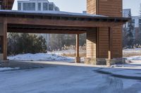 This stock photo features an empty garage and car port covered in snow in front of a high rise building. The scene takes place in Ontario, Canada, during the winter season. The architectural elements of the building, including the road, asphalt, bridge, and underpass, form the backdrop of this residential area. The snow-covered trees, roofs, and road surface create a picturesque view of the real estate property. The shadows and shades cast by the beams and structural elements add depth to the image. The clear sky overhead contrasts with the freezing cold temperature, creating a mesmerizing urban scene. The concrete driveway and concrete street leading to the entry of the building portray a sense of stability and structure. The presence of a shed, porch, and hotel in the vicinity contribute to the dynamics of this public space.