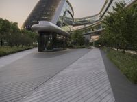 A futuristic office building in Shanghai's Soho district. The sleek architecture reflects the clear sky and artificial light. The building is surrounded by a plaza with trees and a walkway. This metropolitan area in China is a showcase of modern urban design.