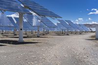 This stock photo showcases large solar panels sitting in the desert beneath a clear blue sky with clouds. The landscape of the Spanish desert is the perfect location for solar energy generation. The solar panels are made with composite materials and are installed on a sloped road surface. The innovative engineering and technology behind these solar panels make them an efficient source of solar power. The image depicts the harmony between nature, technology, and sustainable energy in Europe.