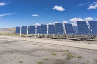 a row of solar panels in the foreground under a blue sky with clouds and green grass