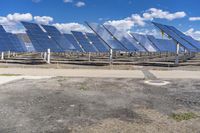 A panoramic view of a solar power plant in Spain. The solar panels are installed on a sloping landscape with a clear sky and horizon. Advanced technology harnesses solar energy on this expansive European road.