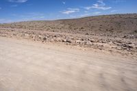 Endless road in South Africa, surrounded by the vast and barren landscape of the African desert. Clear sky stretches to the horizon, with motion blur indicating the speed of travel. Gravel road cuts through the plain, revealing unique Aeolian landforms.