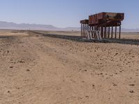 Endless road through the African desert of South Africa. Clear sky and open space create a vast and endless landscape. Train tracks run parallel, leading into the horizon. A surreal and captivating scene.