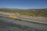 Endless road stretching across the South African desert landscape. Clear sky and mountainous terrain in the distance. Scattered vegetation and sparse grass surfaces along the road. The perfect depiction of the endless beauty of Africa.