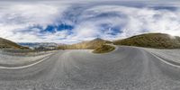 A breathtaking view of a mountain road in New Zealand's South Island. The road curves through the highlands, surrounded by majestic mountains and lush green grass. The clear day sky adds to the stunning landscape.