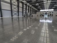 A modern industrial airplane hangar with a private jet in the corner. The open space interior features concrete surfaces and large windows that provide ample natural light. A reflection of the jet can be seen on the warehouse wall.