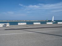 a sailboat is near some concrete blocks by the water and some sand beaching