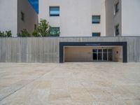 A profile view of a modern architecture office building in Spain. The building's concrete walls and pavers create a sleek and urban atmosphere. The clear sky and open space in the plaza add to the beauty of this European business district.