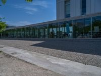 A modern glass wall in a business district in Spain. The hard shadows cast by the architecture create a striking contrast against the concrete and dirt surfaces. This urban landscape embodies the essence of contemporary European design.