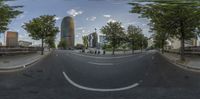A cityscape of Barcelona at dawn, with modern architecture and office buildings lining the road. The open spaces and urban design create a bustling business district. Clouds drift over the city, giving it a distinctly European vibe.