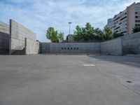 the empty parking lot in front of a wall with apartment buildings on it and a skateboarder on a ramp