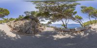 the view of a sandy beach looking at the water and trees on the shore is fisheyeed