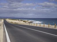 A coastal road in Fuerteventura, Spain. The asphalt highway lines the ocean, with the desert landscape and clear blue sky as the backdrop. The guard rail marks the horizon of this stunning European scenery.