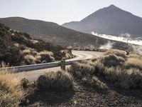 A road in the highlands of Tenerife, Spain, winding through a picturesque landscape of mountains and hills. The clear sky and wild nature create a sense of tranquility and adventure. The Armco barriers ensure safety in this European wilderness.